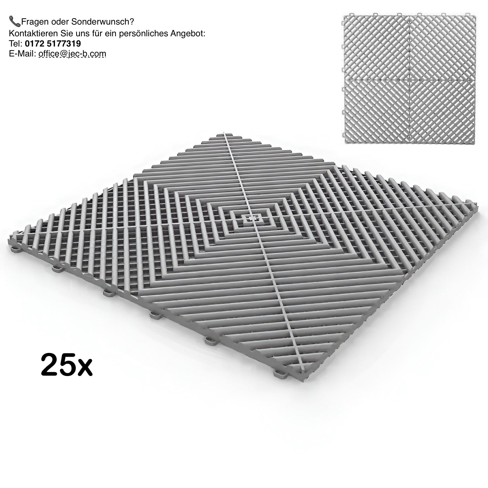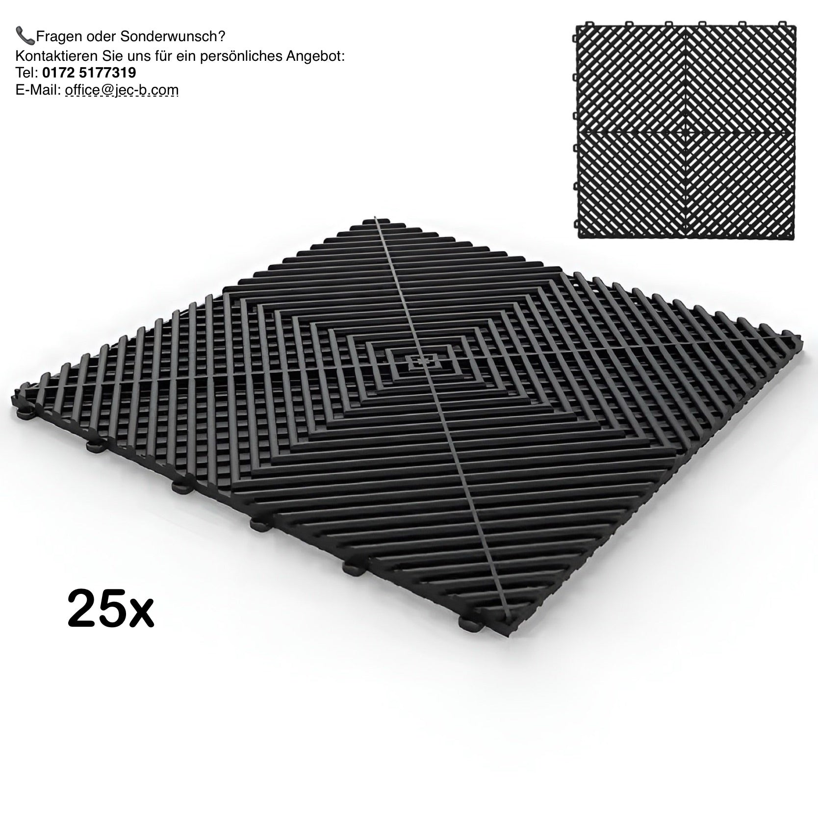 Der Garagenboden von Jec-B® überzeugt durch seine robuste Bauweise, Hitzebeständigkeit und Pflegeleichtigkeit. Ob in der Garage, Werkstatt oder im Showroom dieser Bodenbelag macht überall eine gute Figur. Dank des praktischen Click-Systems lässt sich der Belag werkzeuglos verlegen – schnell, einfach und flexibel. Auch die Autowäsche direkt auf dem Belag ist problemlos möglich: Durch die durchdachte Konstruktion kann Wasser einfach unter dem Boden ablaufen.
